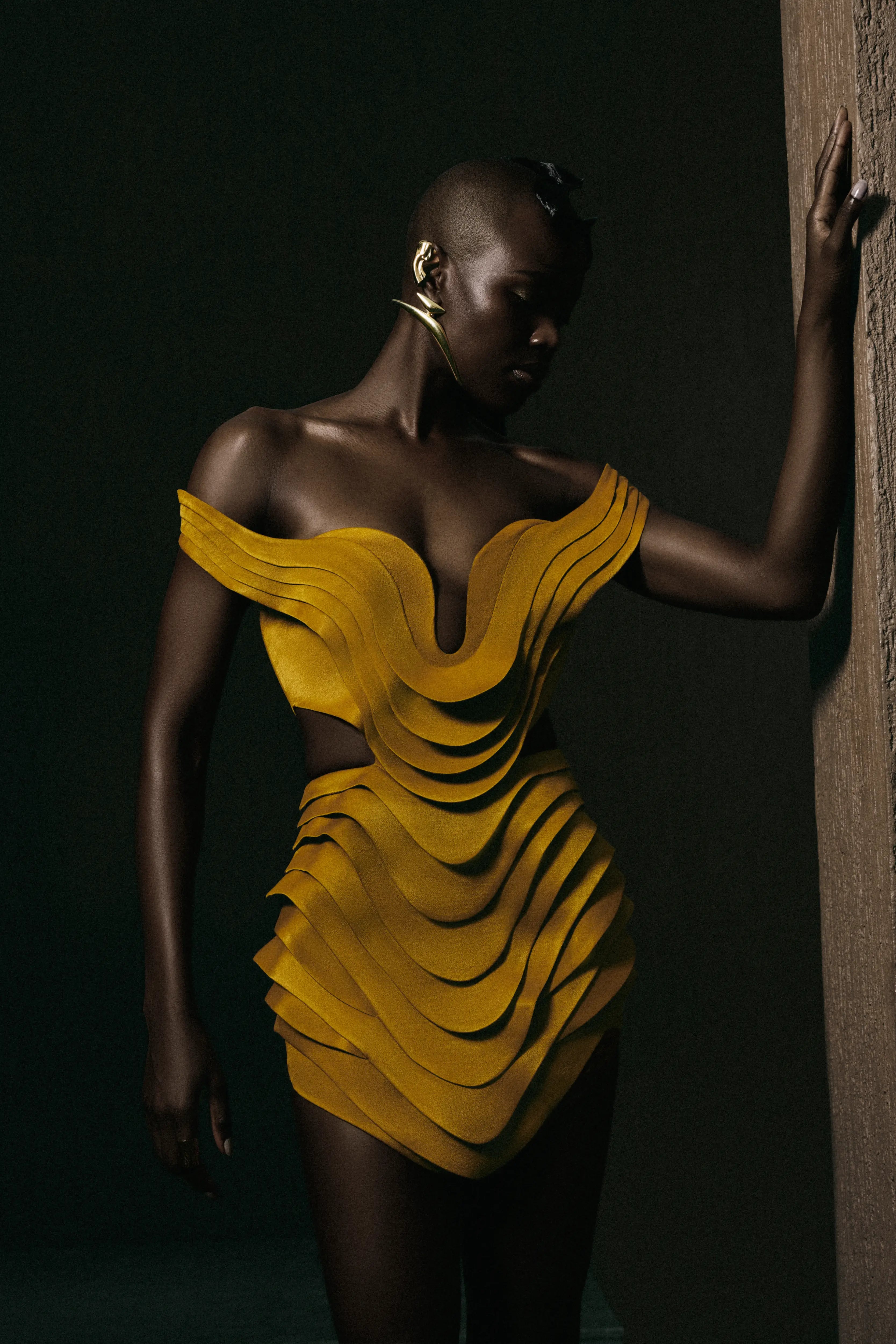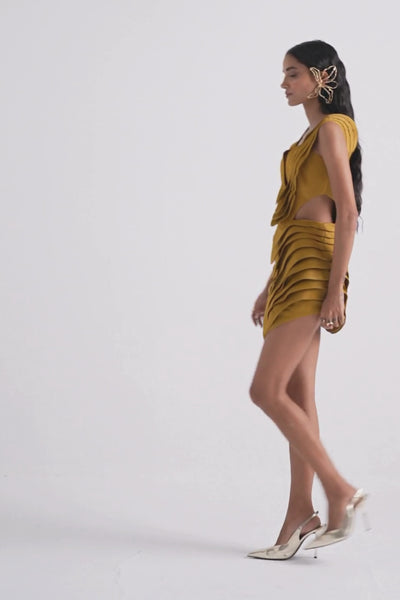 A sculptural reverie brought to life—this haute couture mini dress is a masterclass in architectural elegance. Crafted from sumptuous moss crepe in a burnished rustic gold, it evokes a sense of modern opulence with every curve. The off-shoulder silhouette frames the décolletage with effortless allure, while intricately engineered 3D paneling carves a bold, avant-garde form that celebrates the female silhouette. A gleaming gold metal zipper at the back provides both function and finesse, accentuating the contoured fit with precision. A harmony of craftsmanship and contemporary glamour—designed for the woman who commands attention with refined strength and sculptural grace.